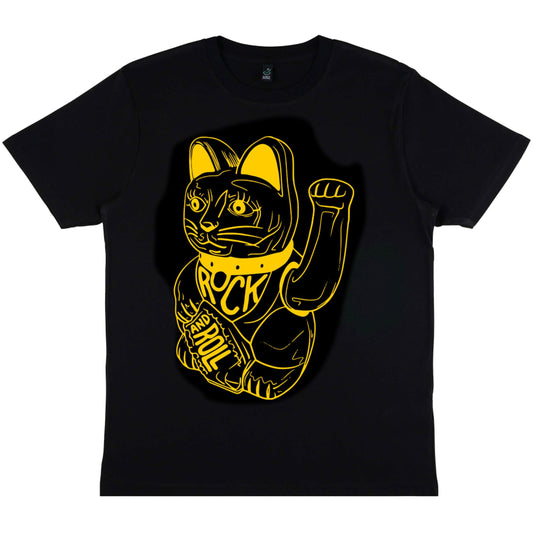 DB DEADBEAT Lucky Cat Rock and Roll Motif Screen Printed Eco-Friendly Unisex Black T-Shirt for Men, Women and Teens.