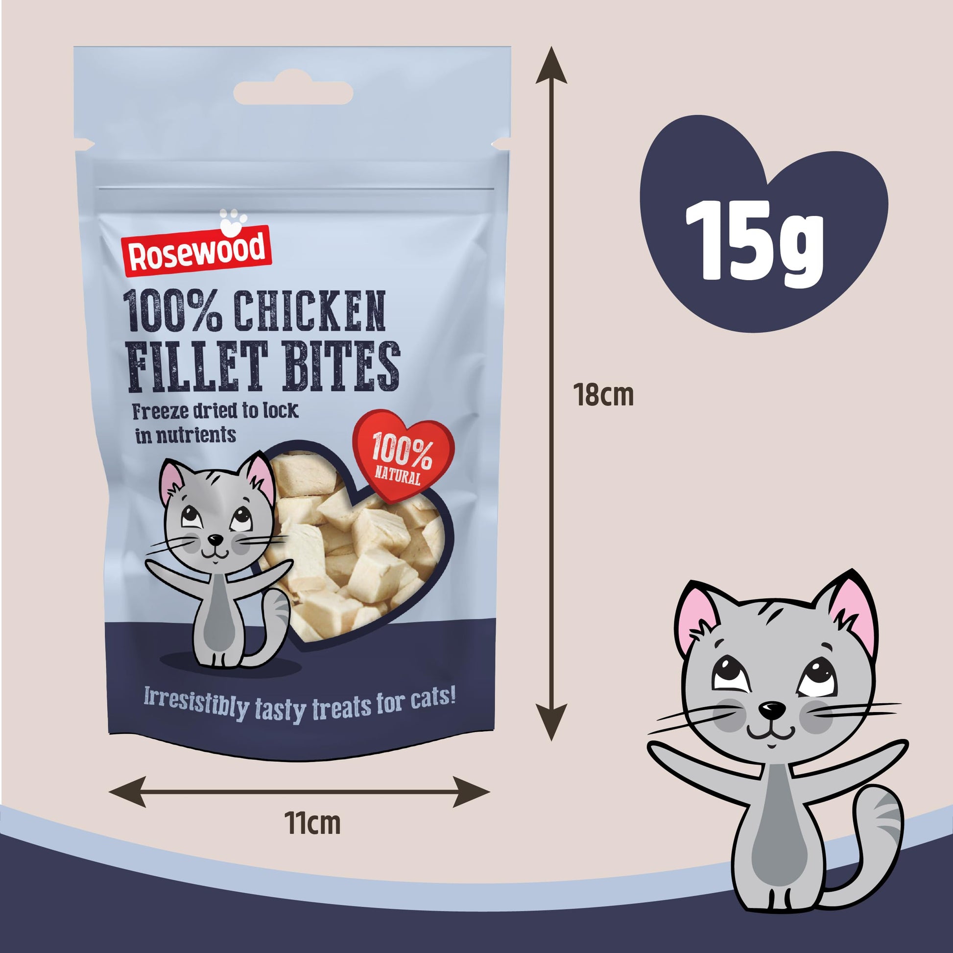Rosewood Freeze Dried Chicken Bites for Cats - All Natural Chicken Fillet, Small, Bite-Sized Cat Treats, Grain-Free, Natural and Healthy Cat Snacks (Case of 12 x 15g Packs)